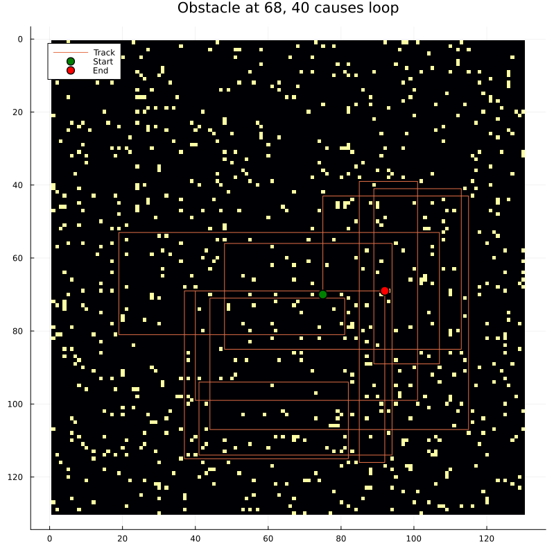 The walkgrid is important: where its value is 1 marks places it makes sense to pose an obstacle. So we iterate through those locations and count the loops.