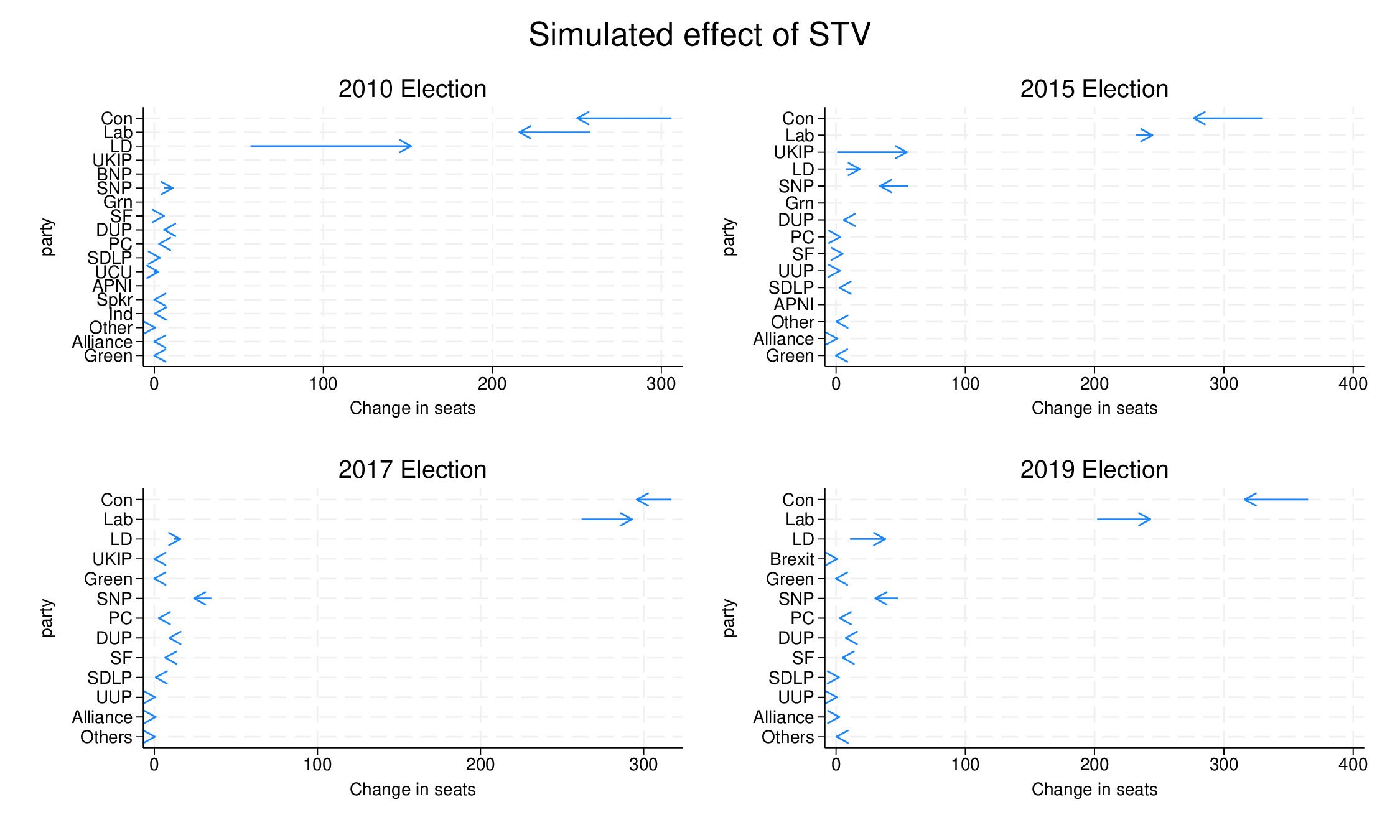 In all elections the Tories get more seats than the mean simulation gives them. For Labour, it varies: FPTP overstates their support in 2010 and understates in in 2017 and 2019. The LDs showed very well in 2010 but would have done much better under STV. On the smaller Scottish stage, the SNP benefitted from FPTP in the later three elections (where they did well).