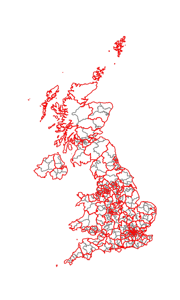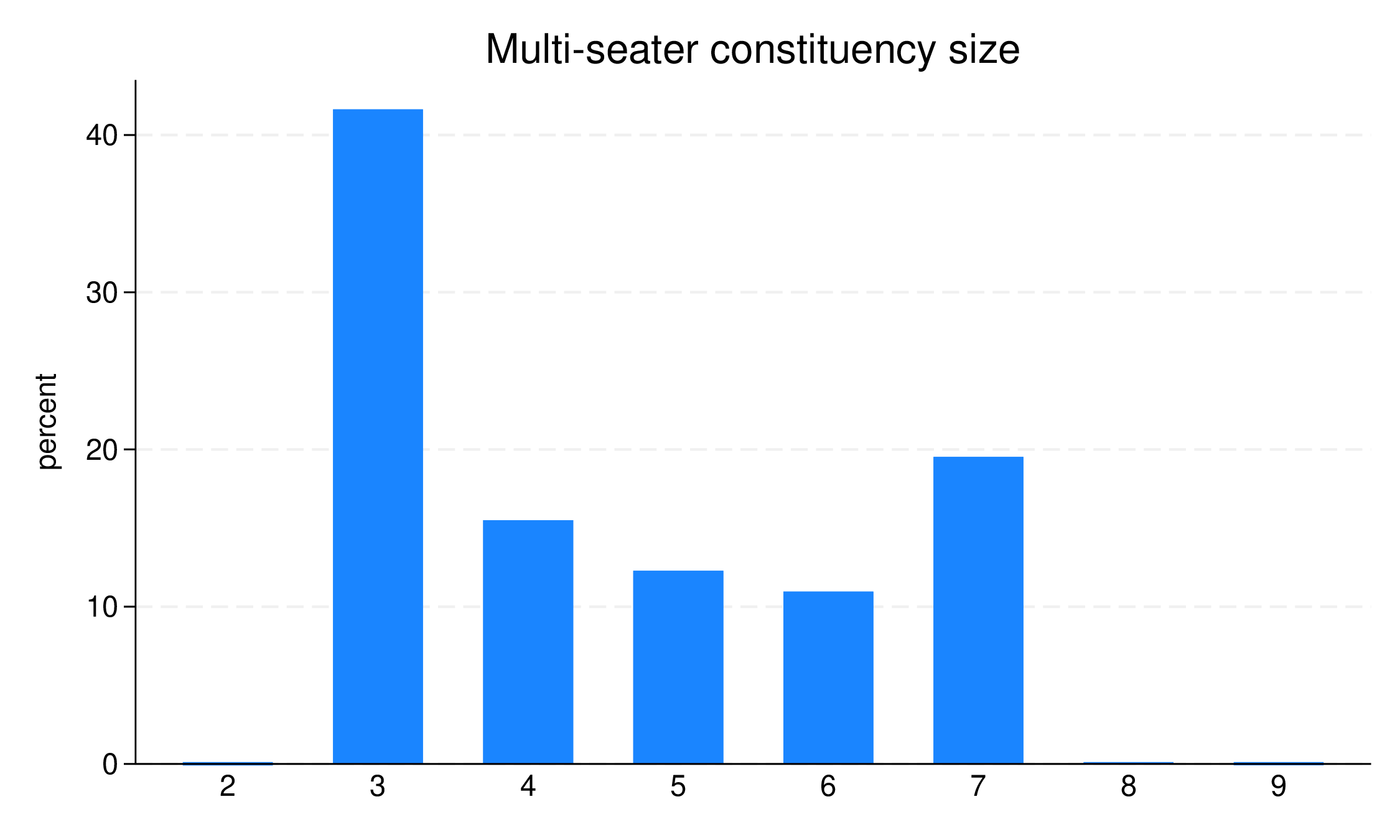 The most recent four elections (2010, 2015, 2017 and 2019) were conducted with the same set of constituency boundaries. We use digital versions of these boundaries to amalgmate single-seat constituencies into multi-seaters (https://www.data.gov.uk/dataset/76a9c59b-647f-46cc-8511-1cb6d52e5f1d/westminster-parliamentary-constituencies-dec-2021-uk-buc). Only adjacent constituencies are amalgamated, and the Scottish and Welsh borders break adjacency and are respected by the results. Island constituencies have to be made “adjacent” by hand (i.e., marked as adjacent to one or more mainland constituencies), but otherwise adjacency literally means a shared boundary. The target multi-seater size is 3-7 seats (which is achieved just short of 100% of the time), and an attempt is made to minimise the resulting perimeter (which is a computationally convenient way of favoring more compact multi-seaters).