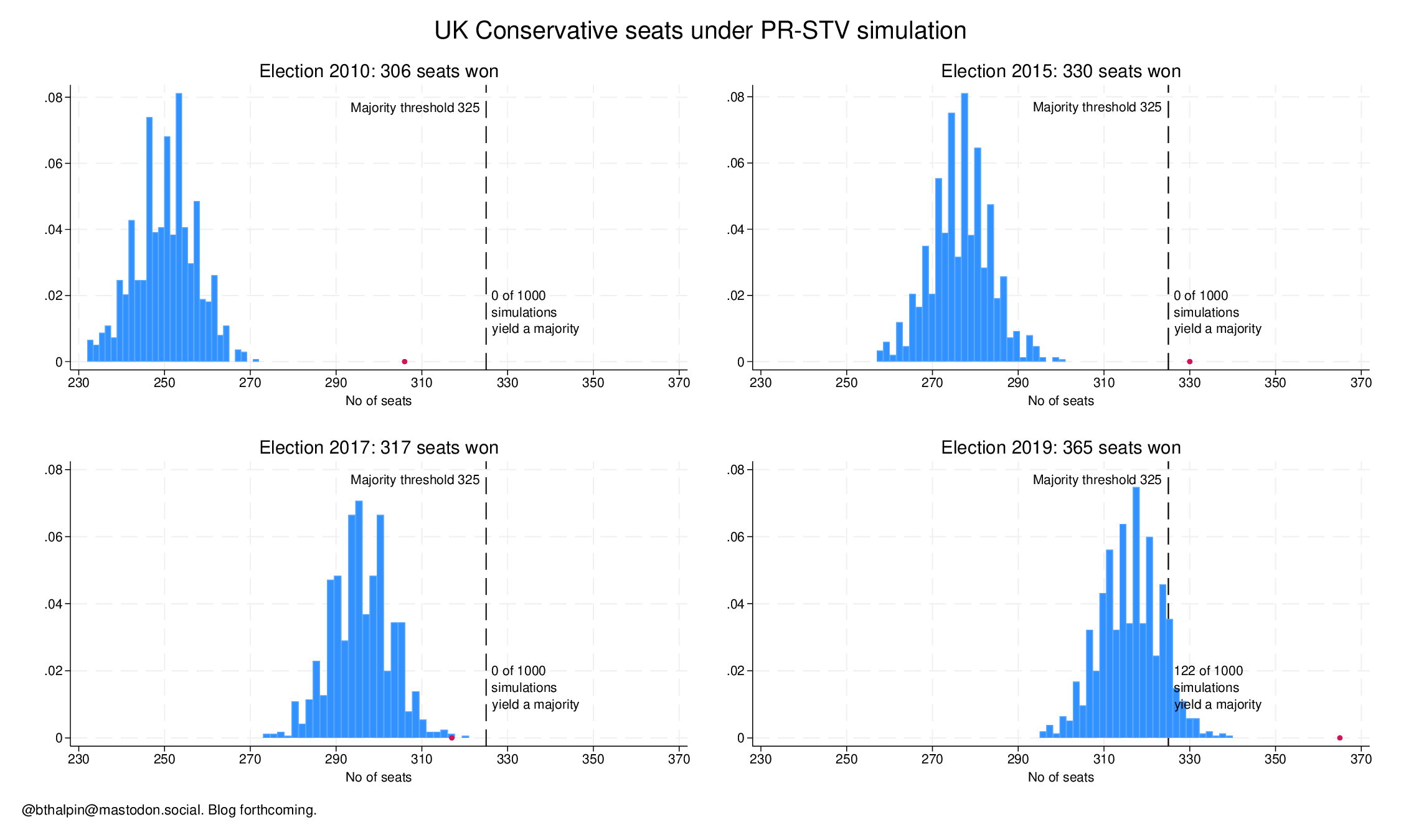 Only in the 2019 election, with its very healthy real-life majority, do any of the simulated results give a majority: about 12% of them.