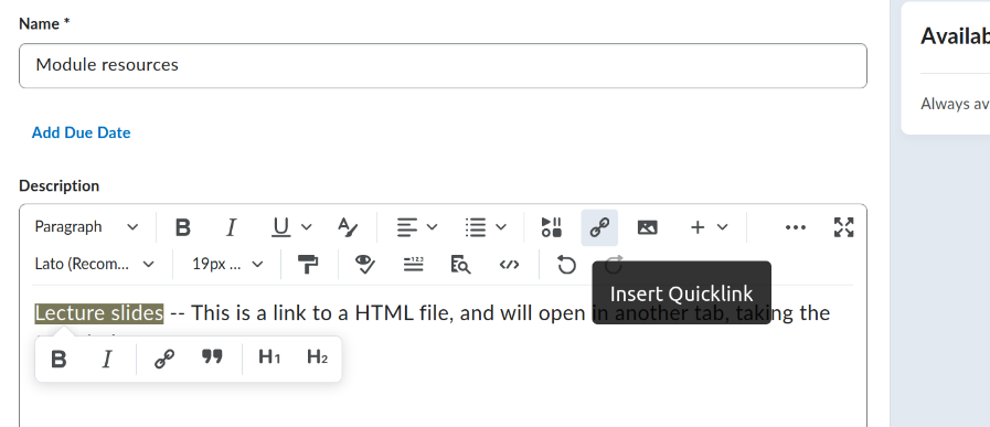 Go to the “Content” area and create a new topic-button by clicking on the “+New Unit” button. To put a link in the body, click on the “Insert Quicklink” icon.
